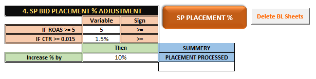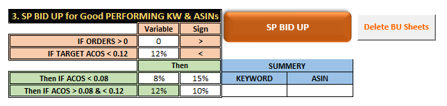 - Bid Increase Specification: Specify how much you want to increase their bids. For example, if ACOS < 12%, increase by 10%.