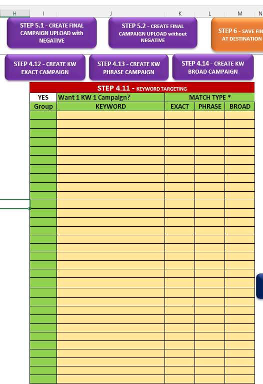 - Specify bid amounts in Columns K, L, and M for exact, phrase, and broad match types.