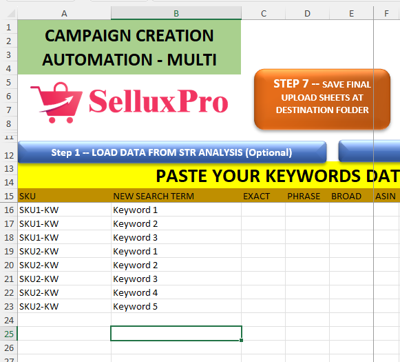 - If SKU 2 has 5 keywords, repeat SKU 2 five times, and so on for additional SKUs.
