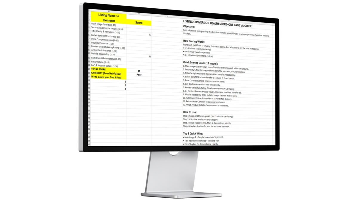 This toolkit turns subjective listing checks into a numeric Conversion Health Score (12–120) so you can prioritize fixes that improve CTR and CVR fast.